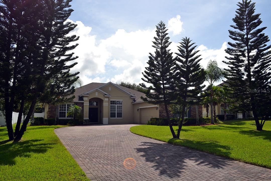 Situated on an oversized lot, this home offers a peaceful retreat with a partial front view of Lake Milly, where you can sip cocktails while enjoying the Florida sunsets. The stone façade greets you as you arrive, enhancing the home's curb appeal. The extended 2-car garage offers ample space for storage or hobbies, while the beautifully paved driveway accommodates six additional vehicles for hosting guests.